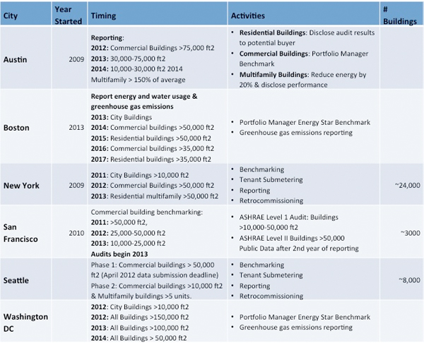 像波士顿这样的条例强调基准和报告,而不是强制实施具体的解决方案;报告要求允许竞争力量提高产品质量,这是任何自由市场动态的情况。一项针对3.5万栋建筑的研究发现,仅仅在“能源之星投资组合管理器”(energy Star Portfolio Manager)中记录它们的能源使用情况,就能减少近2.5%的能源使用。从成本和收入的角度来看,智能能效措施也对净经营收入和资产价值有积极影响,正如最近所表明的那样全球研究由世界绿色建筑委员会颁发。