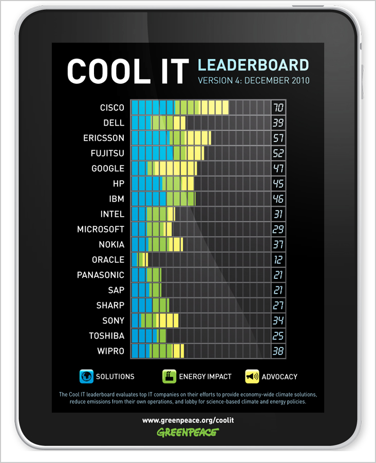 在今天(Cancún)举行的COP16气候大会上,绿色和平公布了其第四份“Cool IT”排行榜——对那些在应用IT解决方案解决温室气体排放方面最成功的科技公司进行排名。